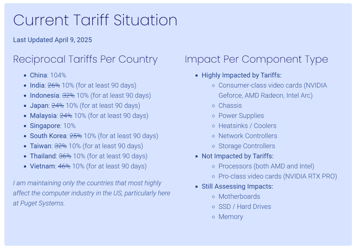 Puget Systems est un fournisseur de poste de travail de boutique plus petit, qui a publié des mises à jour détaillées sur la façon dont les tarifs affectent ses propres coûts et les prix finaux. Puget a également établi une distinction entre les marchandises directement tarifaires et les tarifs indirects – par exemple, tandis que DRAM pourrait être fabriqué aux États-Unis, la carte de circuit imprimé sur lequel il est monté pourrait être expédié en provenance de Chine.